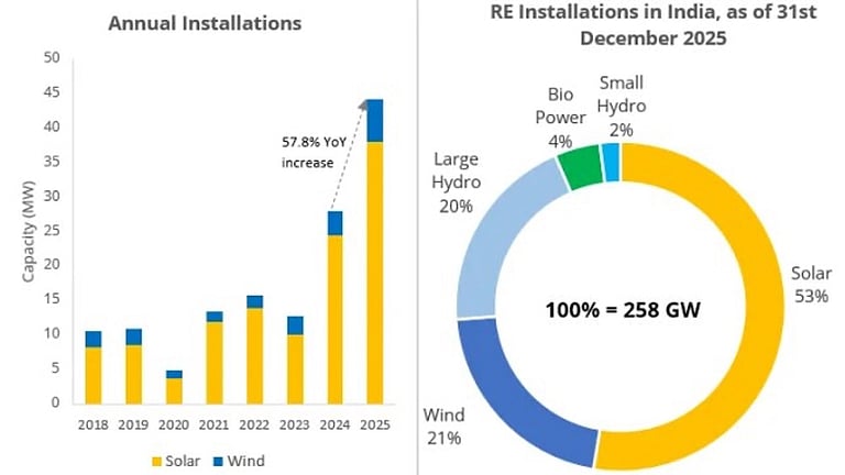 With these additions, solar now accounts for close to 53% of the total renewable energy capacity of India, which reached 258 GW at the end of December 2025. Wind follows next at 21%, large hydro at 20%, biopower at 4%, and small hydro at 2%. Wind energy additions of 6.3 GW in CY2025 improved by 85.3% annually.